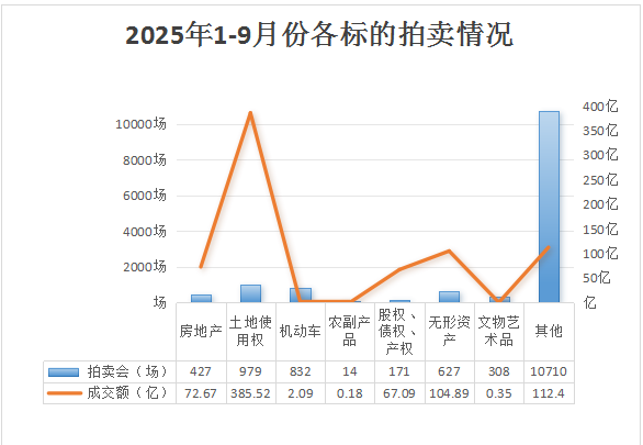 4. 农副产品类:规模最小,1-9月成交场次14场,同比增长40%;成交额0.18亿元,同比增长46.05%。成交场次与成交额同步增长,反映出农副产品拍卖的细分市场逐步起势,与特色农产品品牌化发展、高端消费需求升级及拍卖模式下沉相关,未来具备一定增长潜力。
