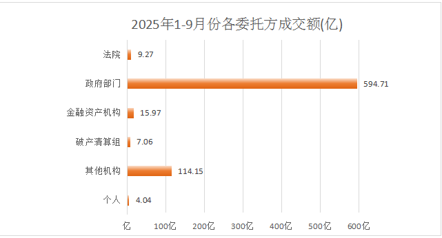 2.政府部门委托:1-9月份成交场次2448场,同比增长11.83%;拍卖成交额594.71亿元,同比增长39.1%。政府部门委托的拍卖业务无论是在成交场次还是成交额上都有增长,这与政府在土地出让、国有资产处置等方面力度加大有关,相关政策也推动了政府部门委托拍卖业务的发展。